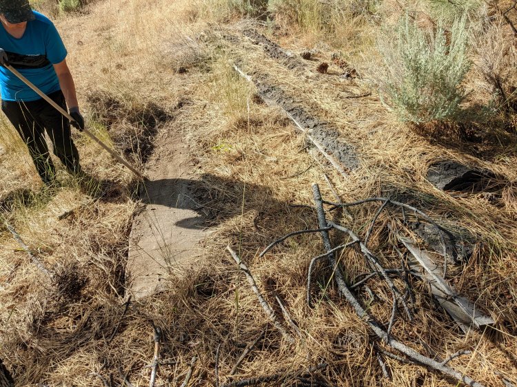 It didn’t take long for the lot to reveal some mysteries. A lot of the sage brush had already been cut a while back and left in place (the power company? the seller?), along with some of the pine branches closest to the power lines. And several large, perfectly milled pine boards that had been apparently cut…and then left there to be covered in pine duff. Or maybe it was intentionally put there for a flat area? Who knows…